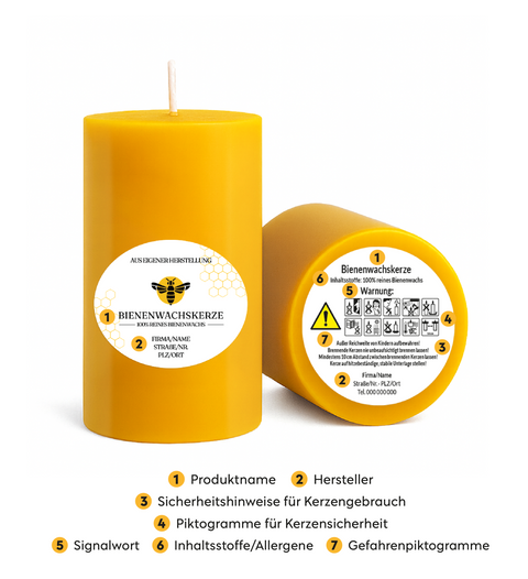 Reine Bienenwachskerzen ohne Duftstoffe oder gefährliche Zusätze benötigen keine CLP-Kennzeichnung, nur die allgemeinen Sicherheitshinweise.